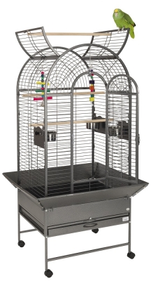 This open/closed topped parrot cage comes complete with 3 stainless steel feeding bowls and 3 perches. It has parrot safe door openings and swing out feeders. The cage is made from wrought iron so is very durable and is oven baked powder coated in non toxic paint. It also has a slide out tray for easy cleaning and is mounted on castors for easy moving. (seed catcher is removable)