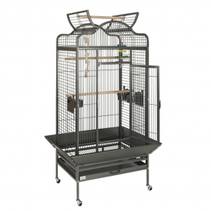 Open or closed top, This cage comes complete with 3 stainless steel feeding bowls and 3 perches. It has parrot safe door openings and swing out feeders. The cage is made from wrought iron so is very durable and is oven baked powder coated in non toxic paint. It also has a slide out tray for easy cleaning and is mounted on castors for easy moving. (Seed catcher is removable)