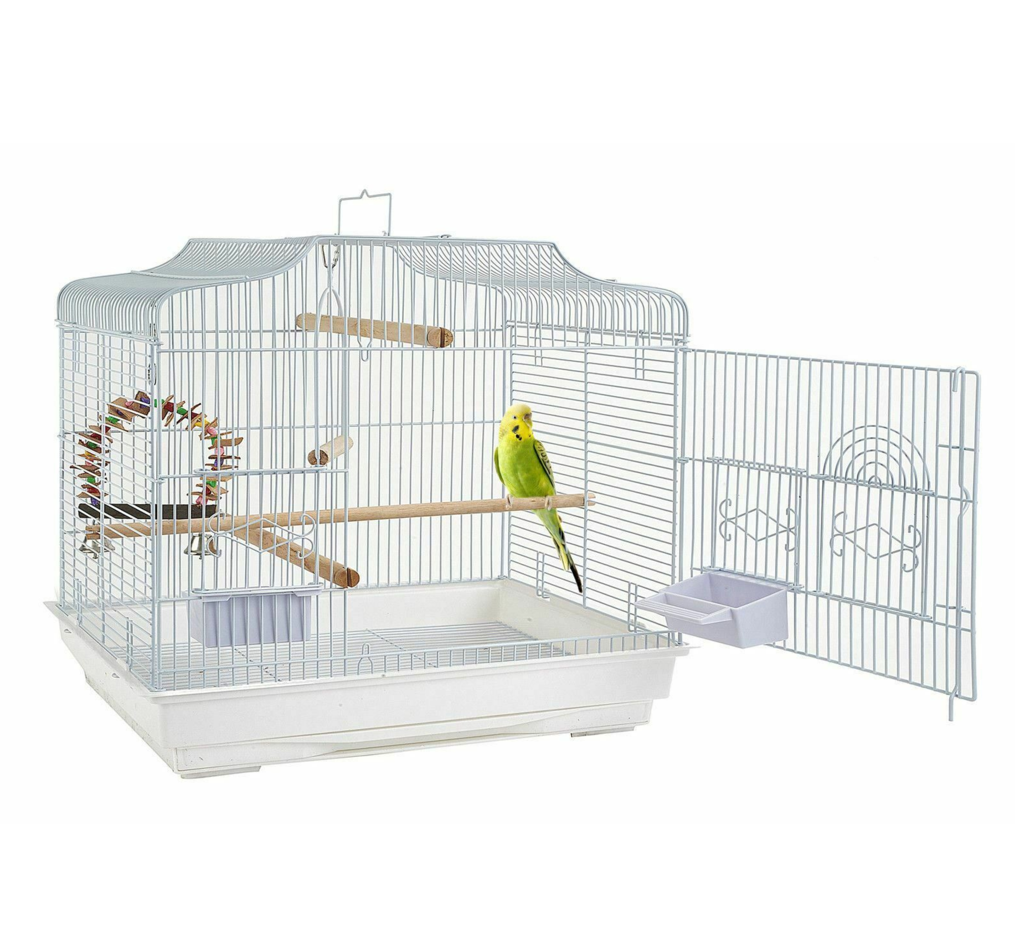 Includes one swing, three wooden perches and two plastic feeding bowls.