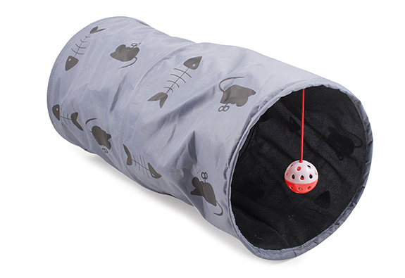 The 50cm play tunnel is a perfect place for your cat to go and hide or play with the hanging toy. In a mono grey crinkly fabric with striking printed clockwork mouse and fish shapes.